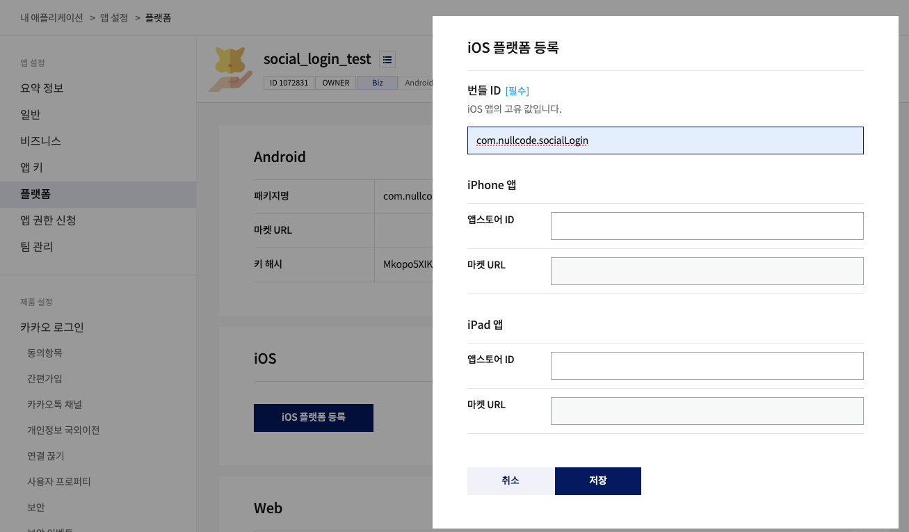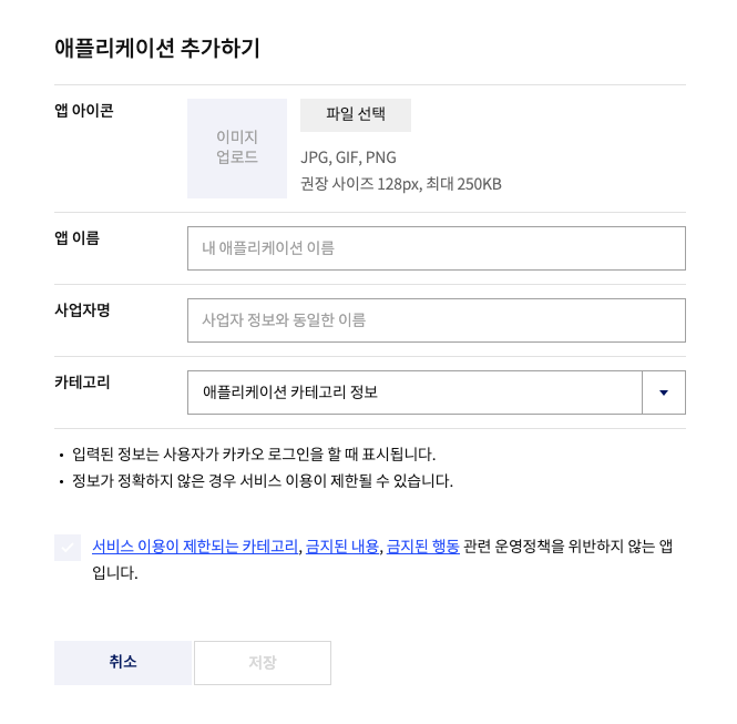 앱 이름, 사업자명, 카테고리 정보를 입력후 저장합니다.