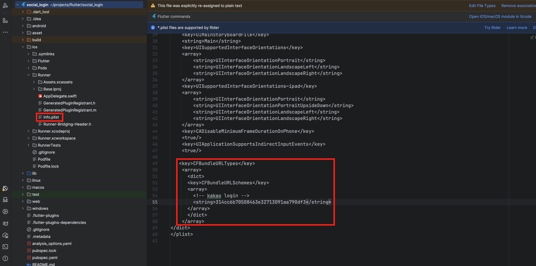 플러터 프로젝트로 와서 ios/Runner/Info.plist에서 iOS URL 스키마 값인 네이티브 앱 키를 넣어줍니다.