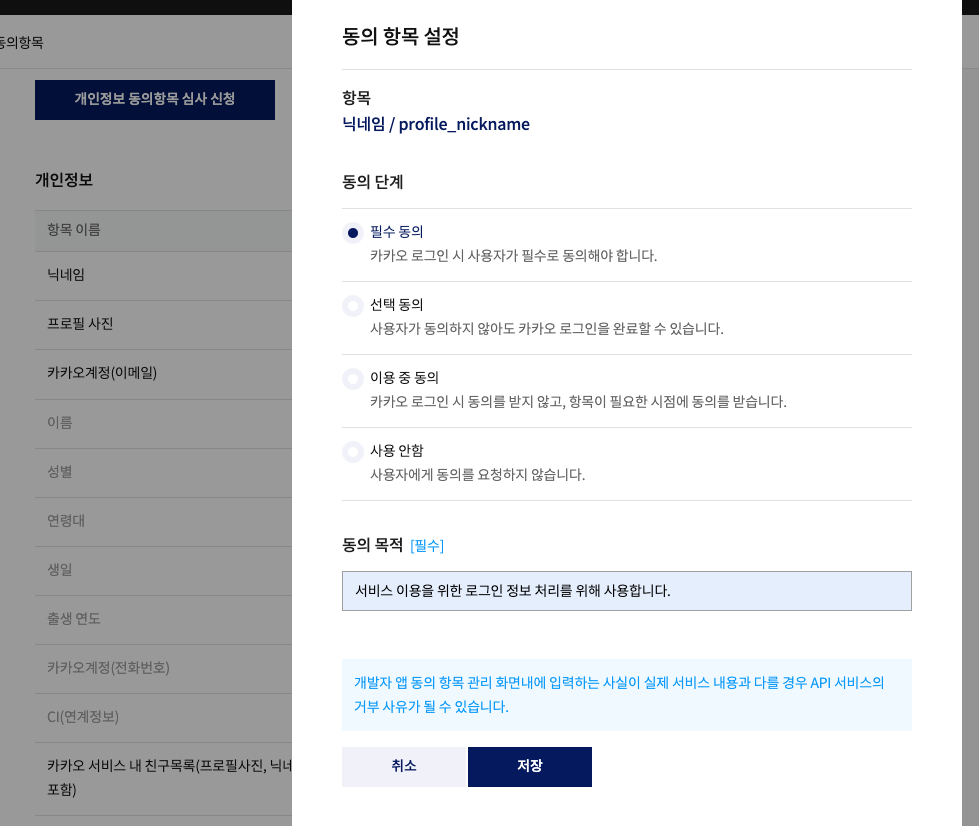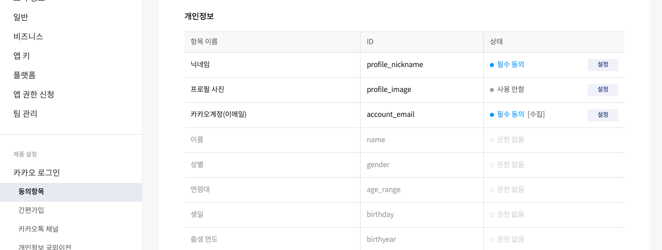 카카오 로그인 아래 '동의항목'에 오시면 카카오 로그인 서비스를 시작할때 동의받을 항목을 지정해줄 수 있습니다.