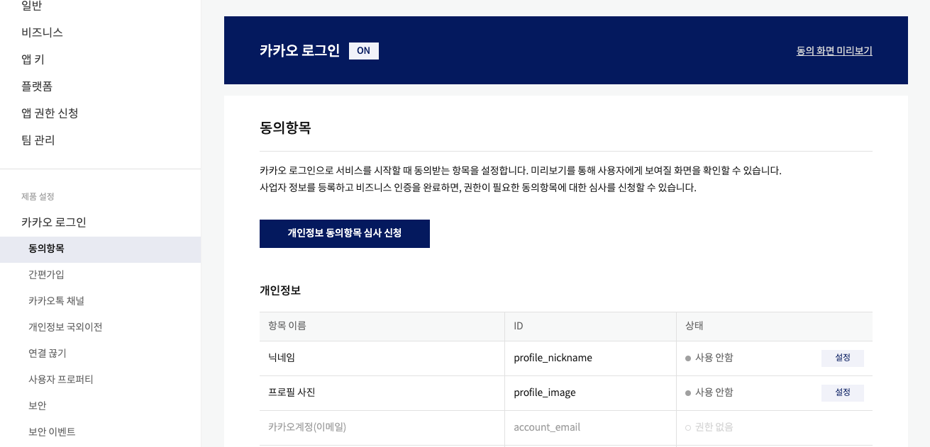 여기서 카카오계정(이메일) 이 권한이 없다고 나오는 경우는 비즈 앱으로 등록하면 활성화 시킬 수 있습니다.