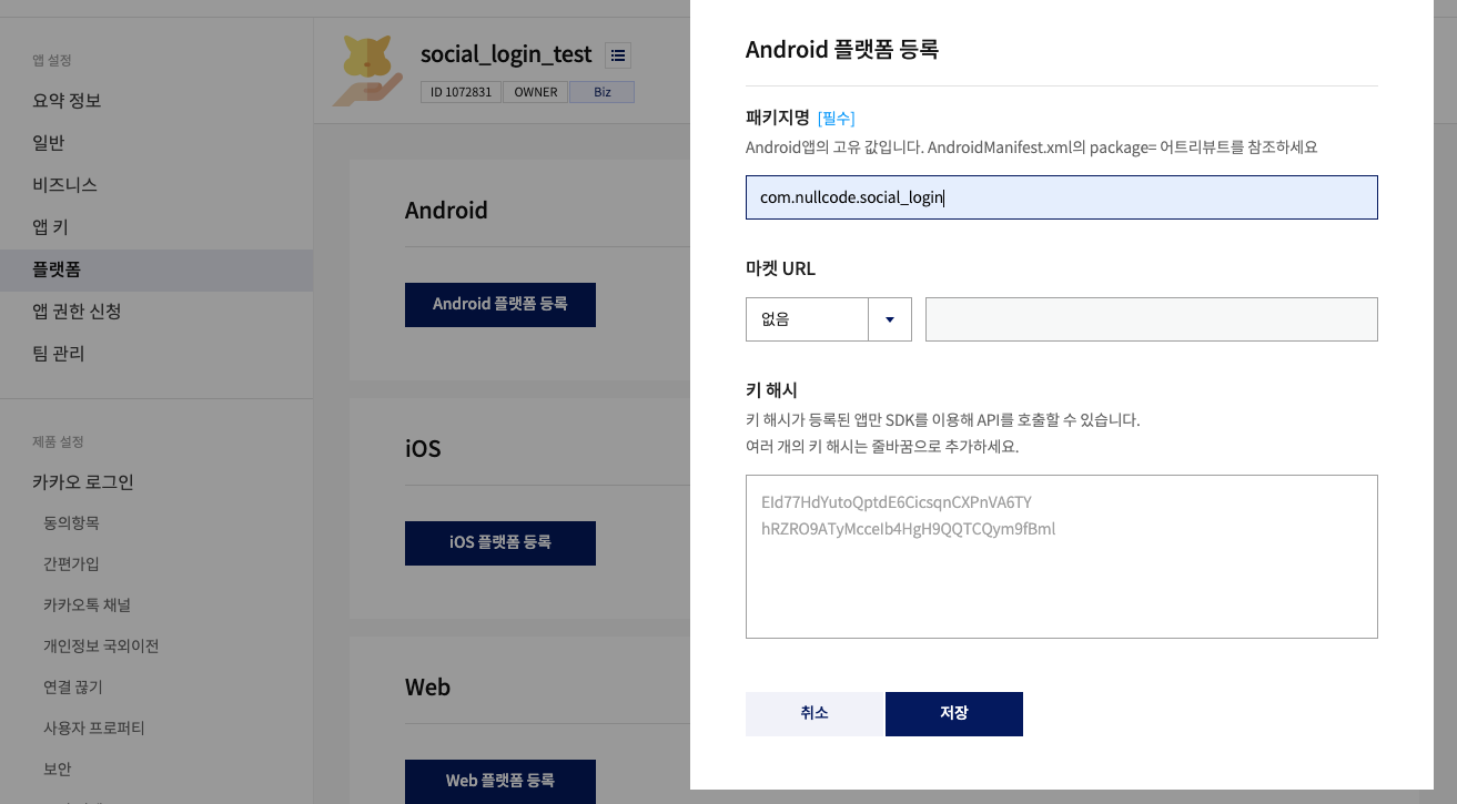 플랫폼 탭에서 'Android 플랫폼 등록' 을 클릭후 패키지명과 키 해시 값을 넣어줍니다.
