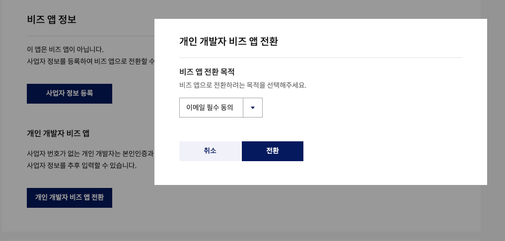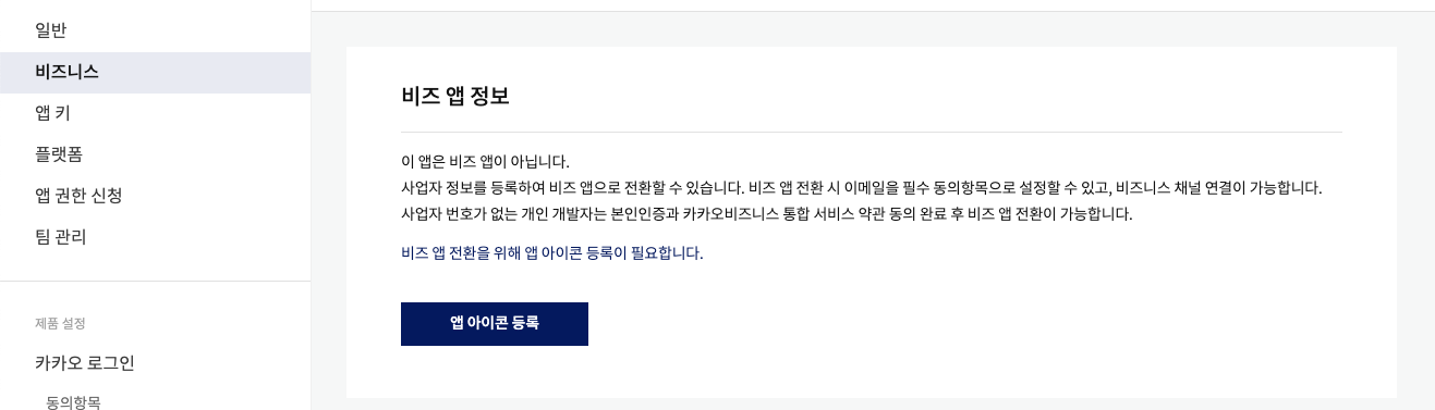 우선 앱 아이콘을 등록해주고 다시 비즈니스 탭으로 돌아오면 '사업자 정보 등록' 과 '개인 개발자 비즈 앱 전환' 이 있습니다. 이 글에선 개인 개발자 비즈 앱 전환으로 해보겠습니다.