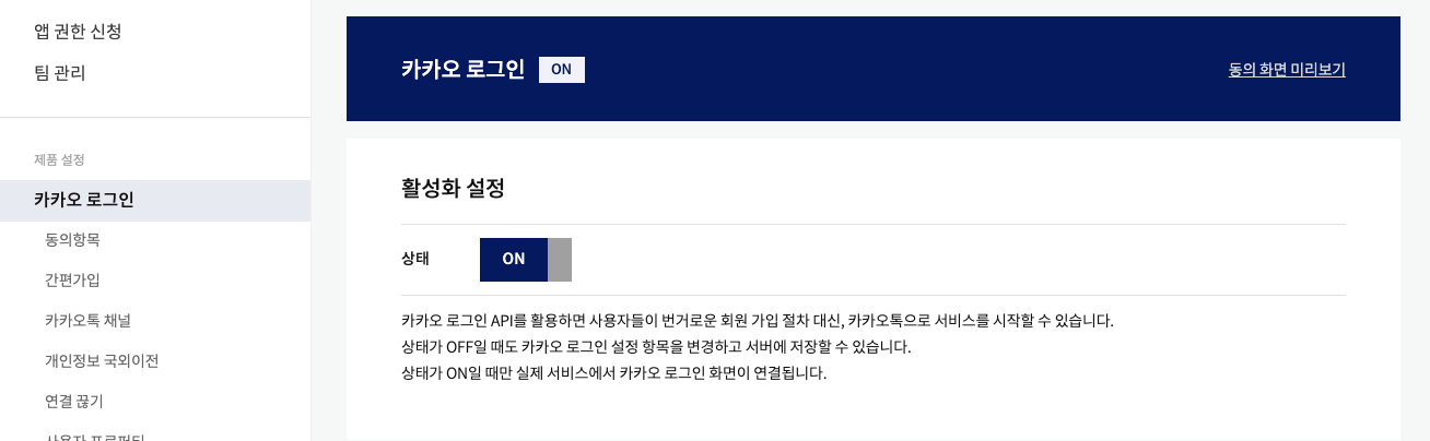 카카오 로그인 탭으로 와서 카카오 로그인을 활성화 시켜줍니다.